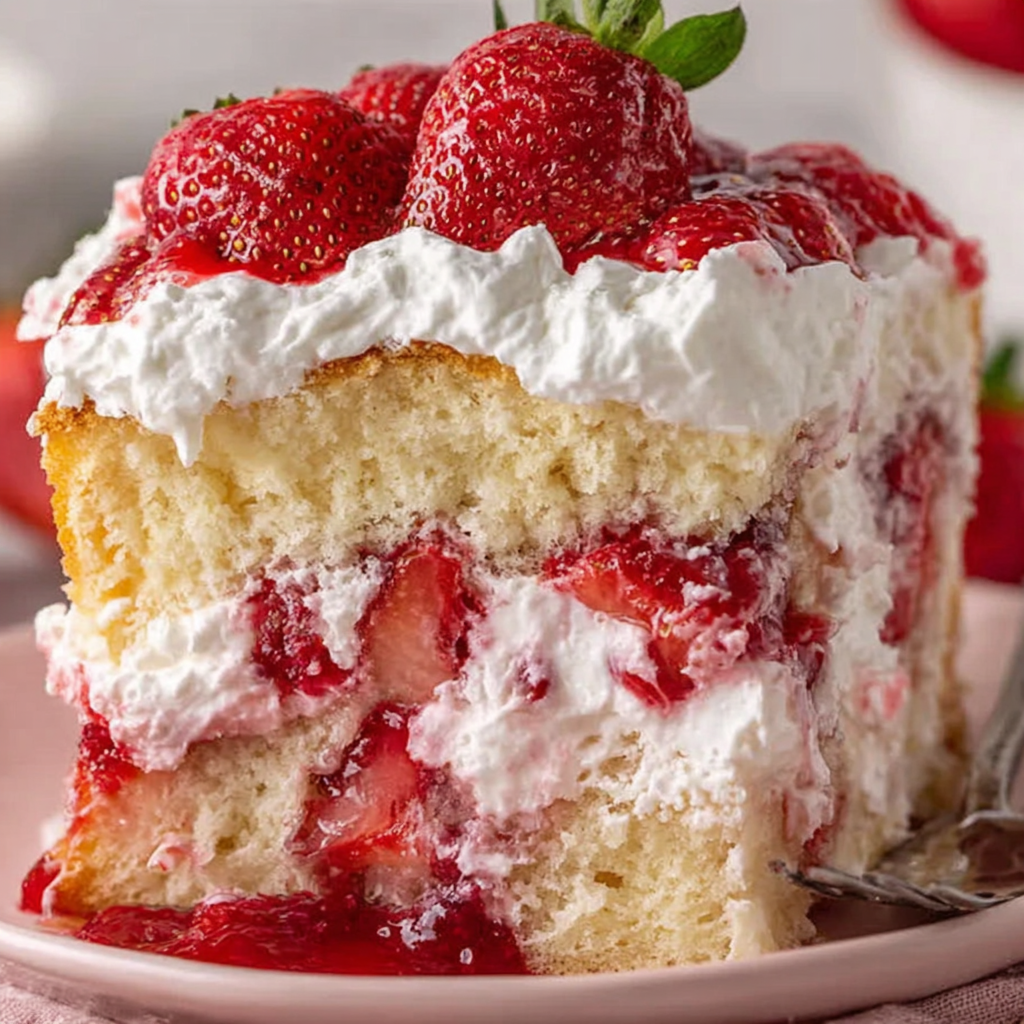 A moist vanilla-strawberry cake with a fruity swirl baked right in, topped with a smooth strawberry glaze and fresh berries. Every bite is soft, slightly tangy, and perfectly sweet 🍓✨
