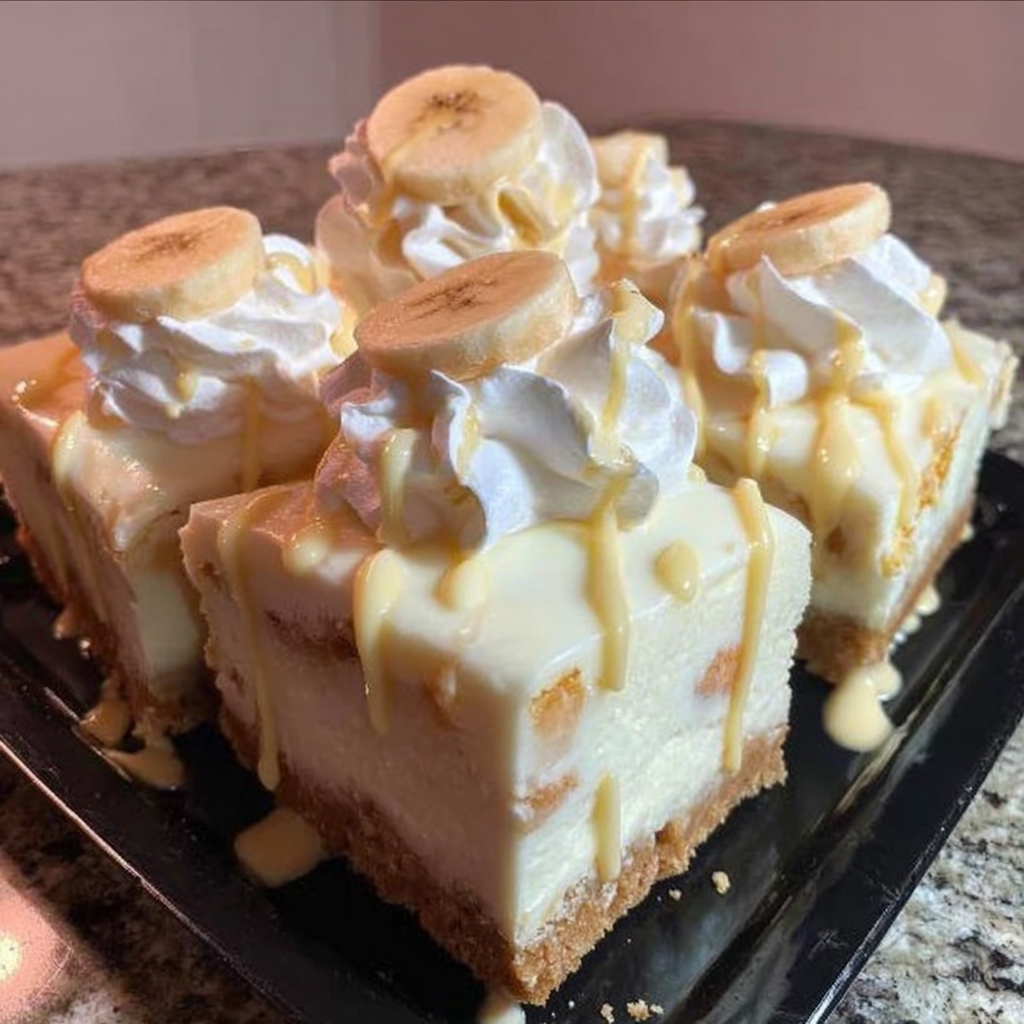 Serve Banana Pudding Cheesecake Squares chilled, topped with crushed vanilla wafers or a dollop of whipped cream. Add fresh banana slices just before serving for the best appearance. These bars pair perfectly with coffee, iced tea, or milk.