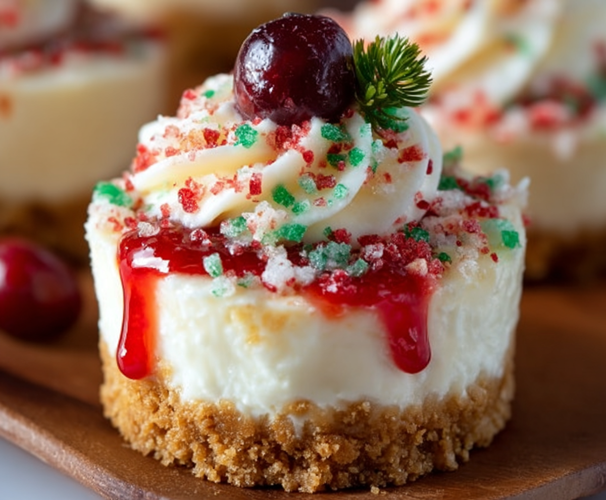 You can dress them up any way you like: crushed peppermint for a cool winter bite, cranberry sauce for a bright tart contrast, chocolate flakes, caramel drizzle, or even simple festive sprinkles. They’re customizable, impressive without effort, and taste like the holidays in cheesecake form.