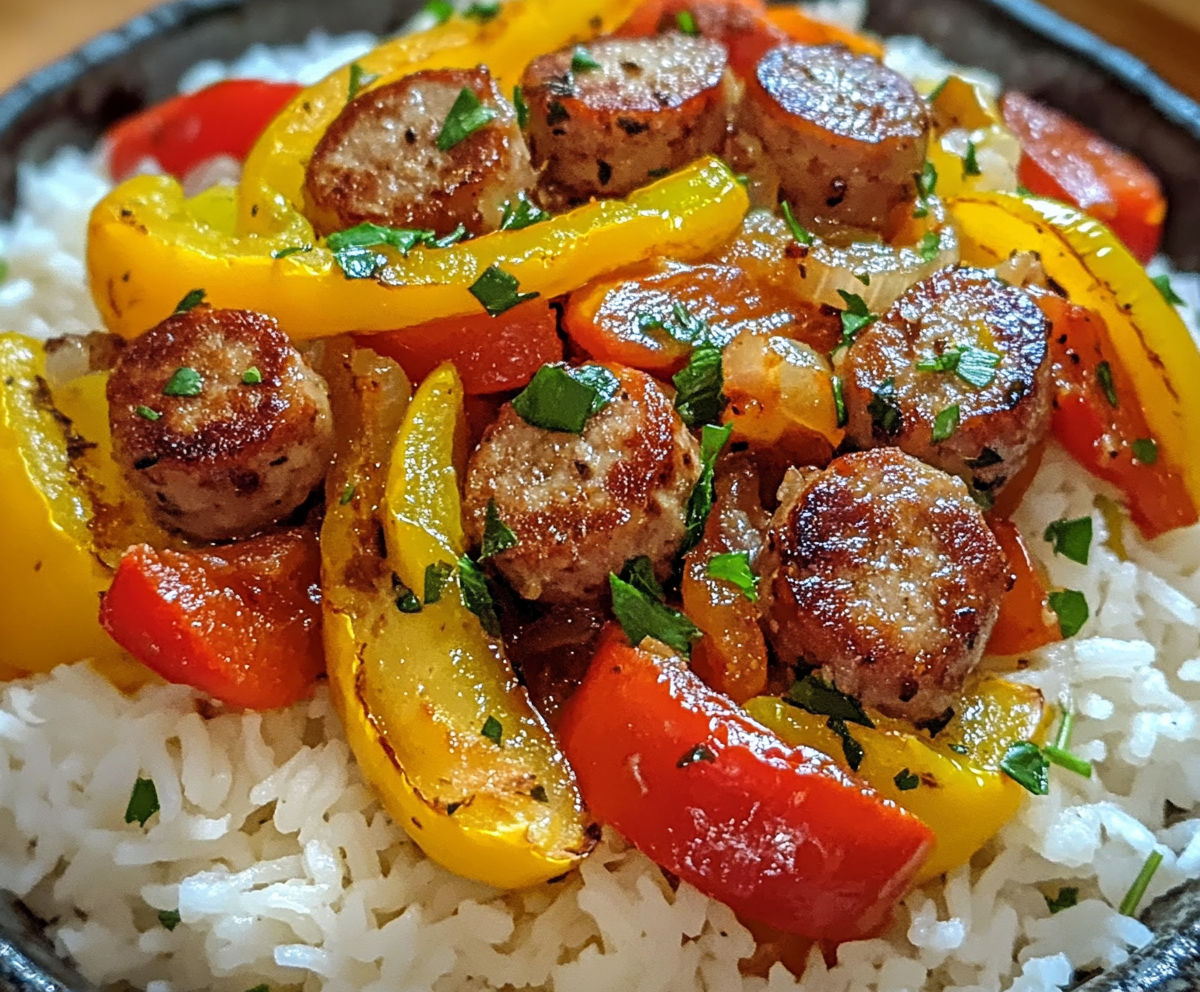 Sausage, Onion, Bell Peppers & Tomatoes Over Rice – Hearty & Flavorful One-Pot Meal