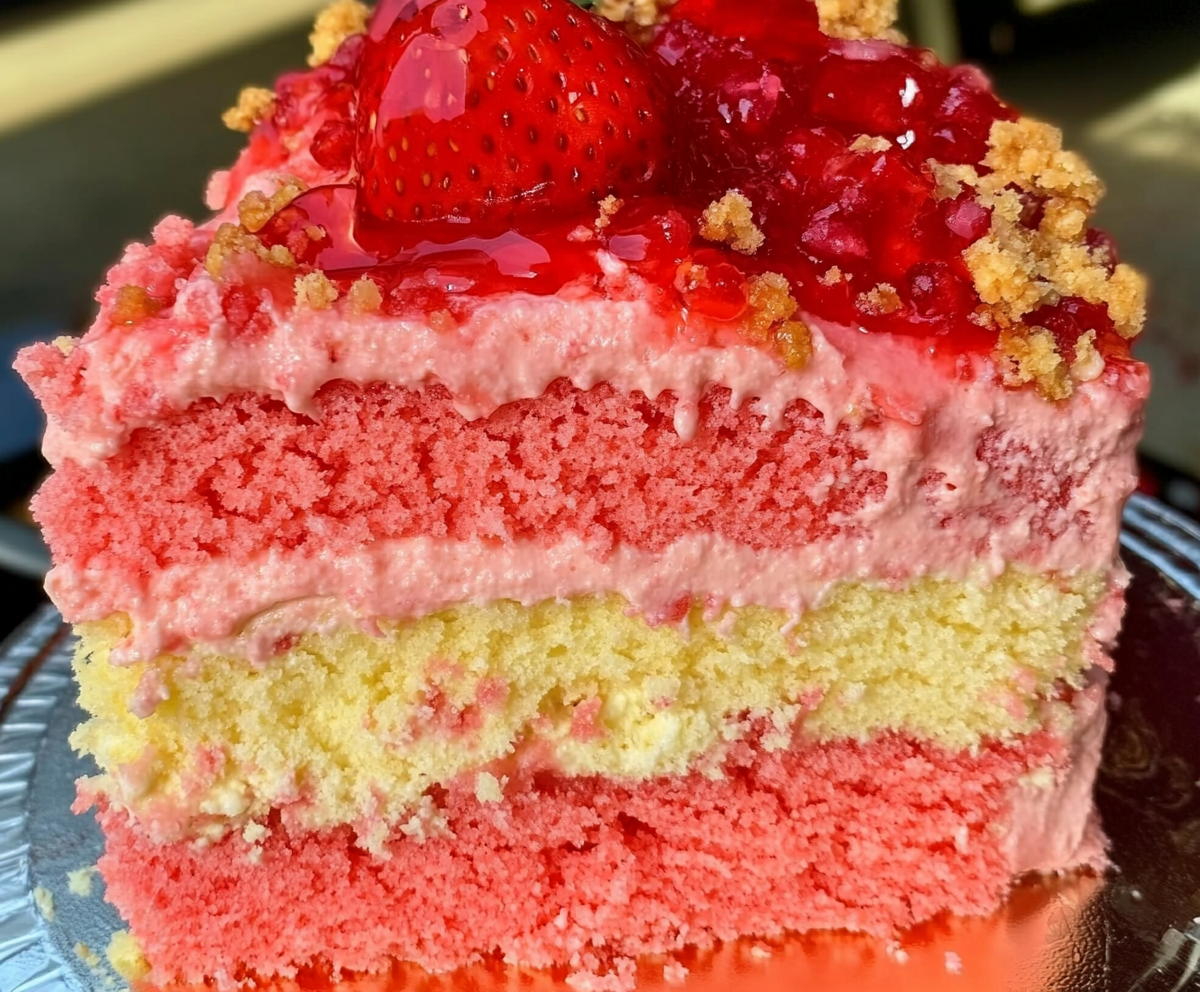 This cake blends textures beautifully: soft cake, silky cheesecake, and crisp crumble. Every bite feels like a combination of strawberry ice cream bars, bakery-style cake, and classic cheesecake. Whether you’re baking for a birthday, holiday dessert table, potluck, or just treating your family, this Strawberry Crunch Cheesecake Cake always becomes the star of the show.