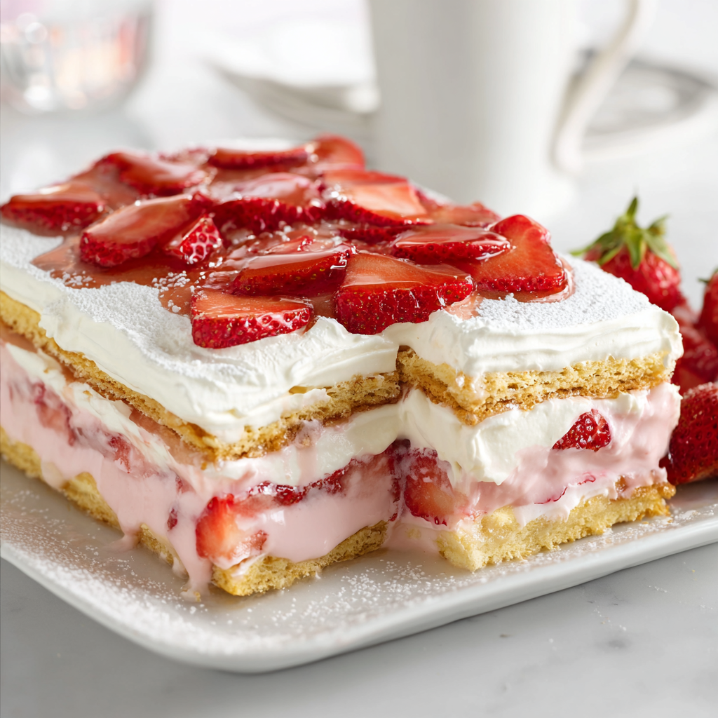 What makes this dessert so special is its texture. As it chills, the graham crackers soften into tender cake-like layers, while the pudding mixture becomes thick, rich, and creamy. Fresh strawberries add brightness and a juicy contrast that balances the sweetness perfectly. The result is a sliceable, elegant dessert that looks impressive but is incredibly simple to make.