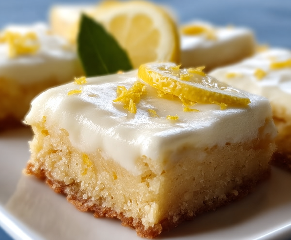 Spread the lemon frosting evenly over the cooled bar base. Smooth the top with a spatula. Optionally, garnish with extra lemon zest, white chocolate drizzle, or fresh berries.
